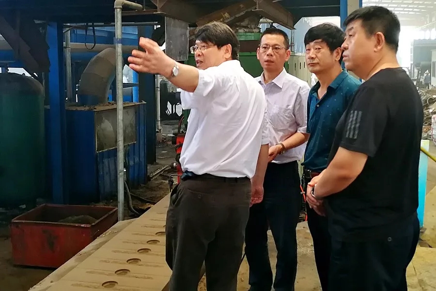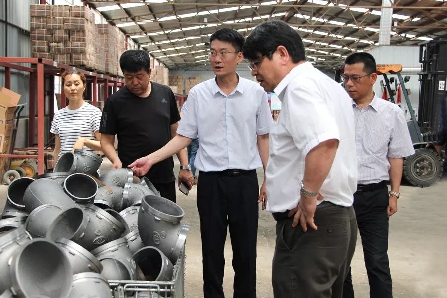 张志勇秘书长一行先到高密志诚机械厂车间实地考察了新型无碳粘土湿型砂在铸件制芯、造型、熔化、浇注及清洁等铸造全部环节的应用情况。现场观察发现新型无碳粘土湿型砂在实际生产中与清华大学、中科院的检测机构出具的检测报告结论一致,即无废气、VOC 、固体废弃物等有害物质产生,并且新型无碳粘土湿型砂在造型中不使用煤粉、型砂可循环利用等特点又大幅度降低了能耗,工人的工作环境也得到极大改善。在潍坊祥润管业车间实地调研时,张志勇秘书长详细询问了企业负责人在使用新型无碳粘土湿型砂半年以来企业在节能、提升产品成品率、不同硬度铸件新型无碳粘土湿型砂与唂粉的配比率、清洁抛丸时间、综合经济效益对比等方面的详细数据和情况,张秘书长还询问了铸造企业的近况及应对国家环保要求遇到的问题,结合国家近期政策导向,对铸造企业今后的发展提出了富有针对性和建设性的指导意见。